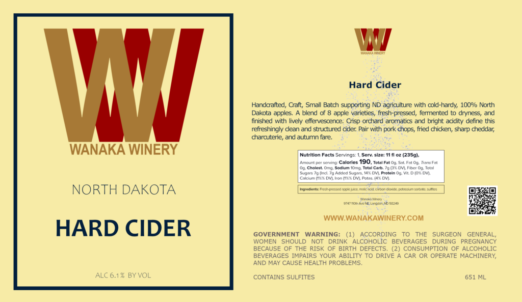 Handcrafted, Craft, Small Batch supporting ND agriculture with cold-hardy, 100% North Dakota apples. A blend of 8 apple varieties, fresh-pressed, fermented to dryness, and finished with lively effervescence.